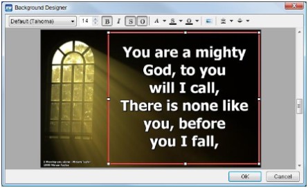 Wenn Sie hier in das Hintergrundbild klicken, erscheint ein Rahmen. Der Liedertext wird nur innerhalb dieses Rahmens eingeblendet. Diesen können Sie so positioniern wie sie es wünschen. Etwa um den Liedertext auf nur einer Hälfte des Hintergrundes darzustellen.