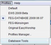 Stellt die Datenbank, die im obersten Menüeintrag ausgewählt, ist (FEG-Database 2009 06 07) neu her. (Bei Problemen mit einer "zerschossenen" Datenbank) |